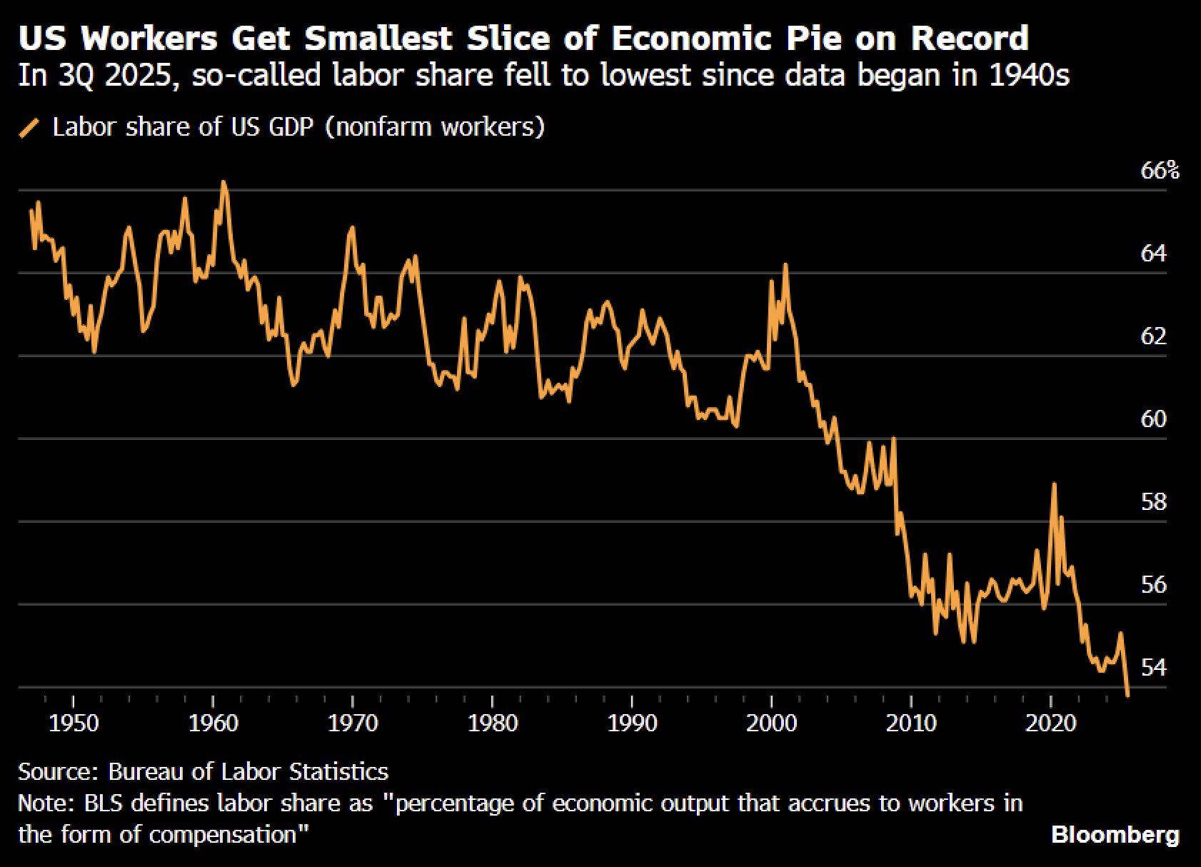 This chart isn’t about a bad quarter or a quirky data revision. It’s showing a long, structural shift. For decades after World War II, workers reliably took a little over 60% of the economic pie. That wasn’t accidental. It reflected strong unions, tighter regulation, limited globalization, and a system that funneled productivity gains back into wages.