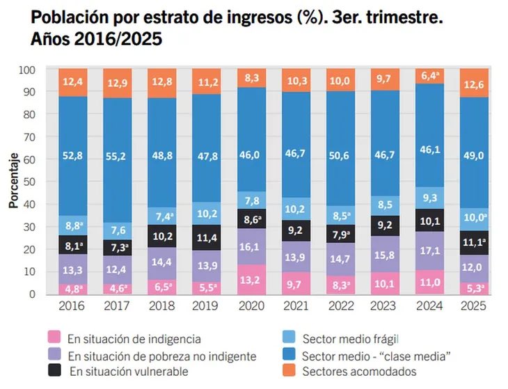 According to the Buenos Aires Institute of Statistics, the poverty rate fell from 28.1% (in the same period of the previous year) to 17.3% in the third quarter of 2025.