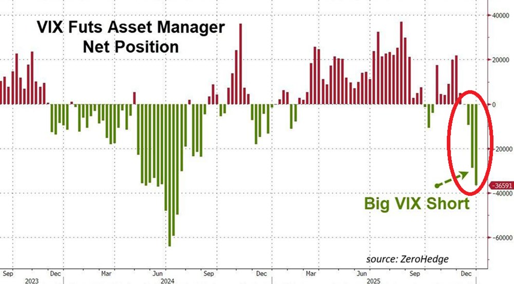 Asset managers have aggressively increased their VIX futures shorts to the highest level since July 2024.