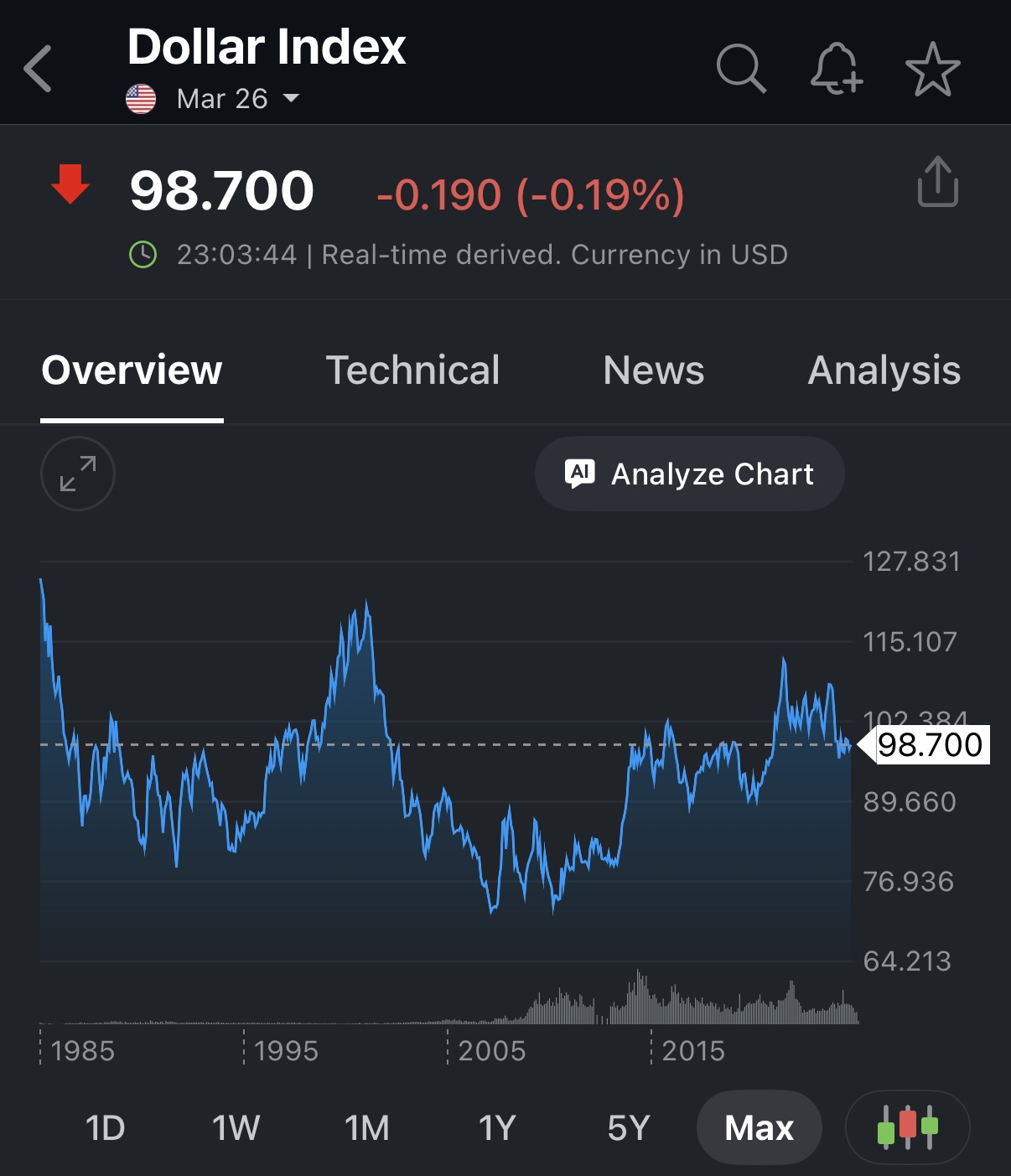 - Weakened Dollar: The Dollar Index (DXY) falls to 98.700 (-0.19%), signaling a loss of confidence in the currency.
