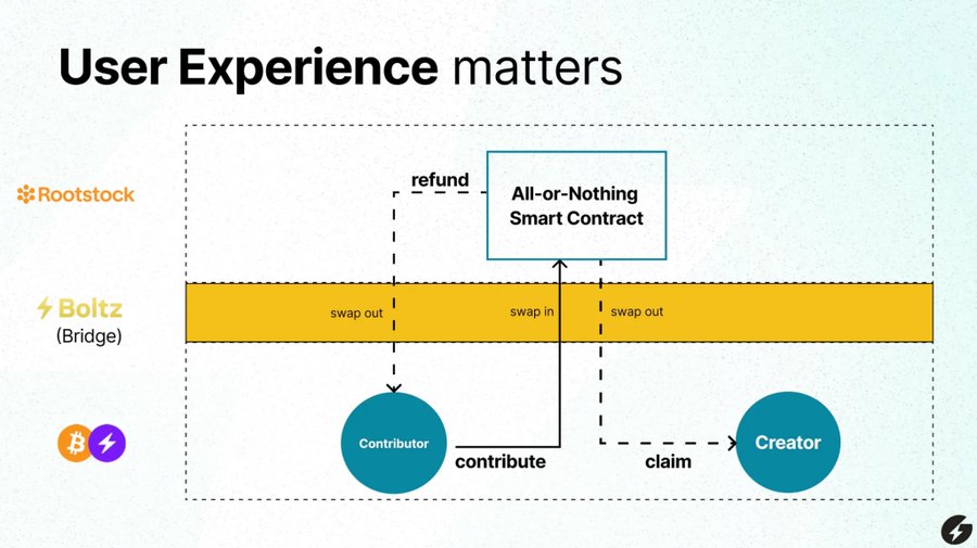 @Boltzhq bridging enables seamless interaction between Bitcoin payments and the smart contract layer, allowing contributors to participate using familiar Bitcoin tools without needing to interact directly with Rootstock.