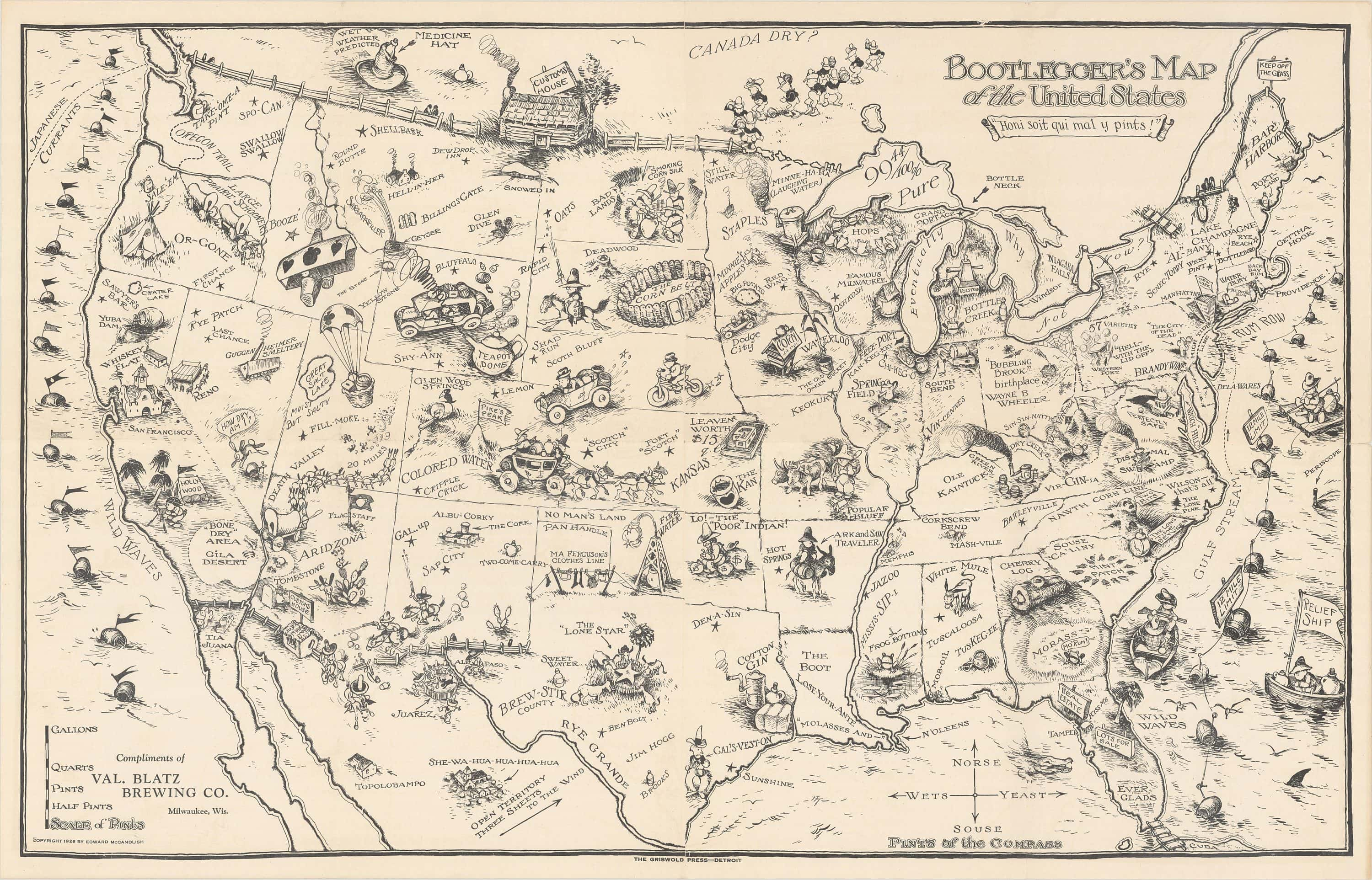 The resulting stew of absurdity, contradiction, and illegality was fertile ground for satirists, among them Edward McCandlish (1887–1946), who gave us this wonderful pictorial map.