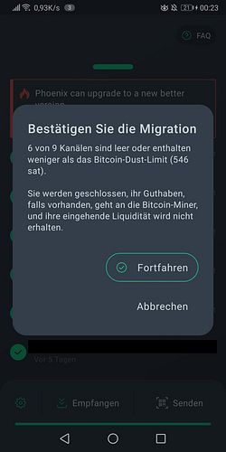 It mentions that 6 out of 9 channels are empty or have less than the dust limit in them. These channels will be closed, the sats will go to the miners and I will lose this inbound liquidity. Maybe I should have filled my channels before migrating so I can keep all this inbound liquidity but I didn't care enough so I continued anyway.