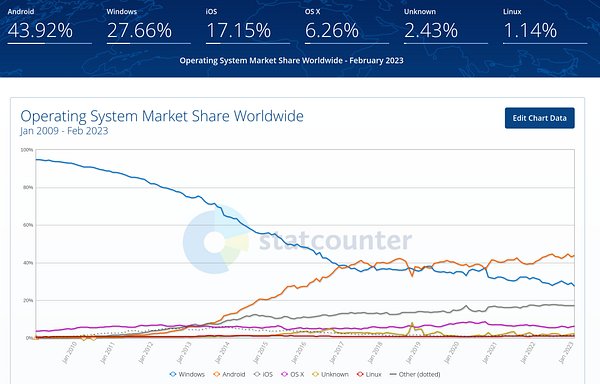 About a decade ago, Microsoft was in control of the majority of the OS in the world.