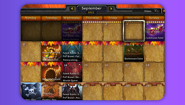 These events can be about anything from the four seasons, anniversaries, random silly ones, competitions, giveaways, etc. Each of these events would have details on what they're about, what activities will happen, and what new quests, achievements, badges, and/or trophies are connected to it.