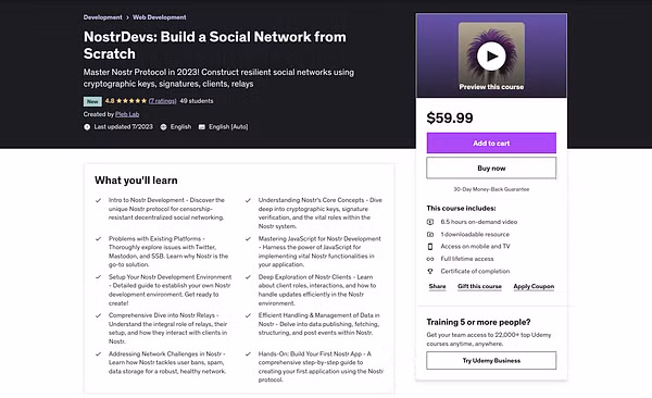 Since its launch on Udemy, there have been 49 enrollments, and the course received an impressive 4.77 rating. Currently, PlebLab's NostrDevs: Build a Social Network from Scratch course is the only Nostr Development course available on Udemy, filling a critical educational gap for this revolutionary protocol.