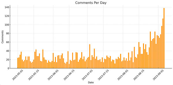 lol, 2.59 comments per minute or 23.16 seconds per new comment so far