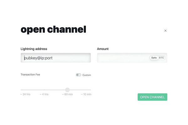 A) The Lightning address is NOT your address. It’s the Lightning address of the person you are connecting to. B) The amount is the amount of sats that you’ll create the channel with. C) At the bottom, you’ll see a Transaction Fee. This is the ‘cost’ of creating the transmission channel.