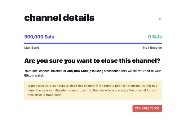 - To close a channel do the following: Click on the Channel you like to close in your Umbrel Lightning wallet. Then click on the red ‚Close Channel‘ button at the bottom of the ‚channel details‘ page and ‚confirm close‘.
