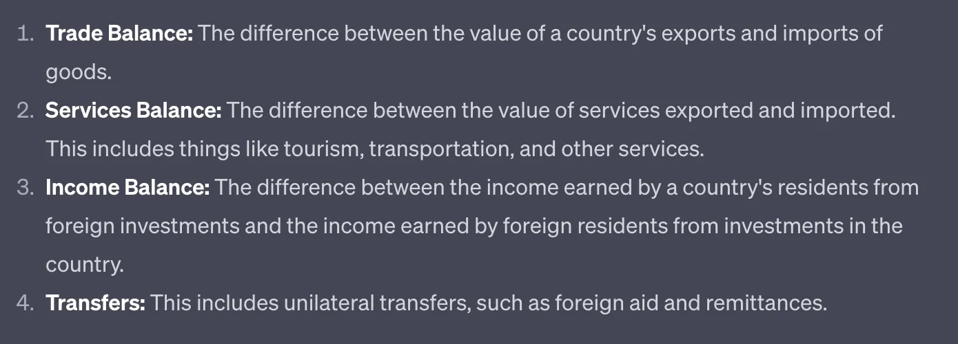 The current account can be broken down into several subcategories which can be seen here: