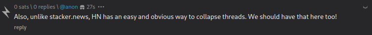 Also, unlike stacker.news, HN has an easy and obvious way to collapse threads. We should have that here too!