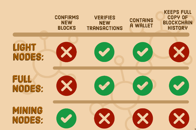 We just went over mining nodes (aka miners), which confirm pending transactions to the blockchain and mine new bitcoin. Full nodes and light nodes are what validate the new blocks and transactions submitted by the miners.