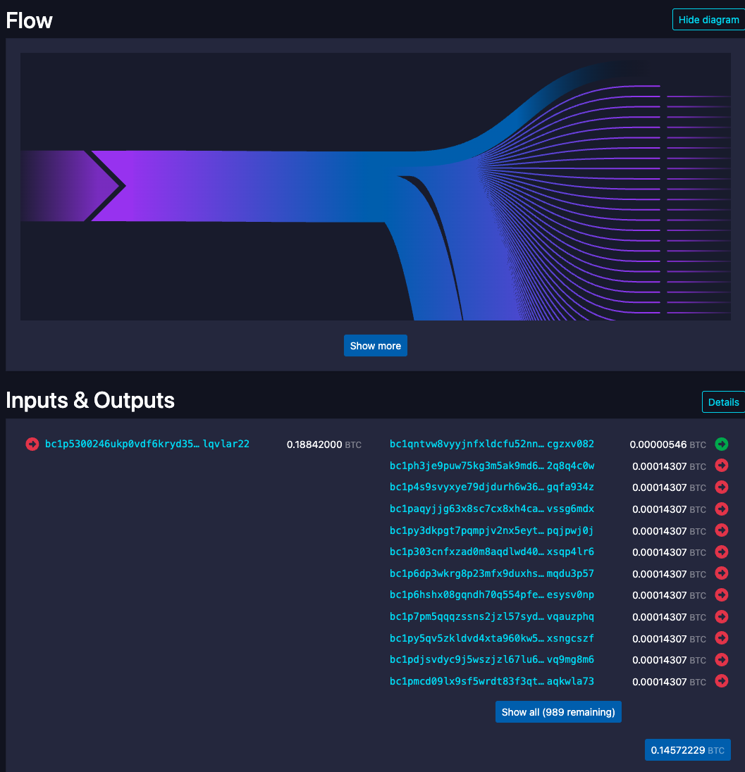 But nearly every block since the fee pump started, we've seen one of these giant taproot UTXO explosion transactions that seems to be just exploding out the contents of a taproot UTXO into 1000 new UTXO distributions: