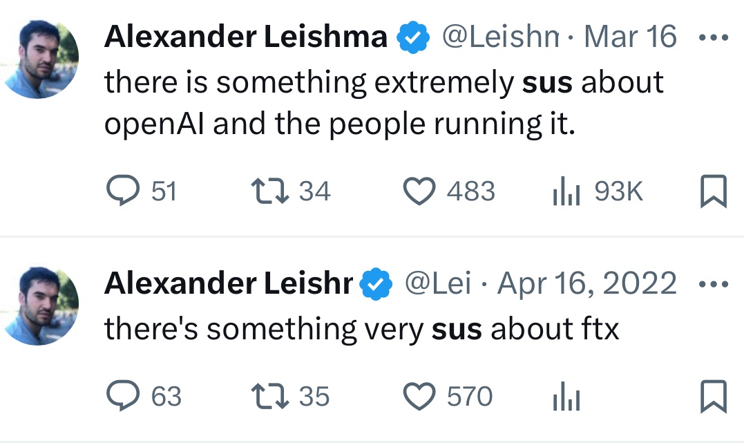 River's Leishman comes to mind for me -- he and many others were calling out FTX, Celsius, BlockFi, etc. long before they imploded, but he was also calling out OpenAI long before what's recently unfolded. He has a good 'sus' radar, as Tuur Demeester put it: