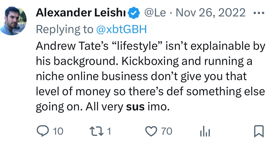 However, he made all his money on investments, he got lucky with crypto and runs scam courses that help you break the matrix. Also this whole thing about him being arrested on suspicious charges is sus to me.