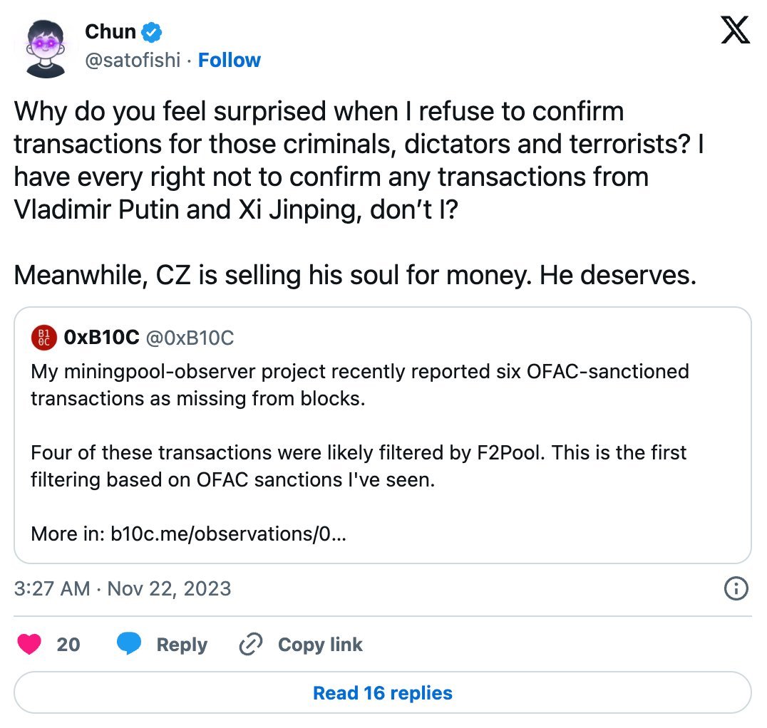 Putin's a genocidal scumbag so I'll give him a pass on getting emotional about it. The founder of F2Pool seems to have fled China, another awful country. He's probably got personal feelings about this stuff based on his experiences.
