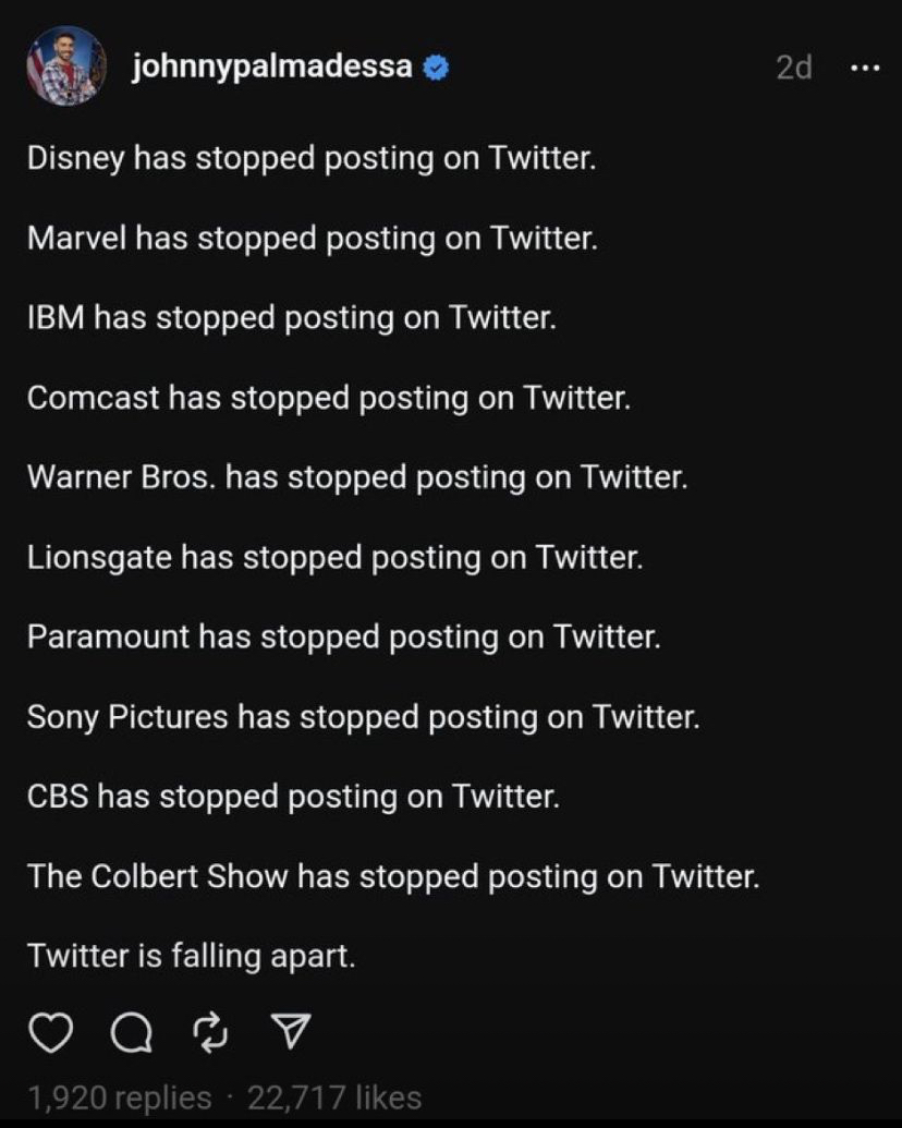 Twitter is falling apart not only because some woke companies decide to show some virtue-signaling and throw a tantrum to Elon. It is falling apart because the whole clown world is falling apart and it has become a central part of this system. Regardless millions of users/bots still using it, its original ethos has completely disappeared and it is now just a clown show. "Everybody is screaming and nobody is listening" paraphrasing Dorsey I think. This is why I closed my account and work for the future of Nostr.