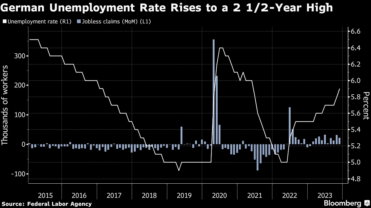 The recession is slowly beginning to eat into the labor market. After an increase of 22,000 unemployed, the unemployment rate rose to a 2.5-year high of 5.9%.