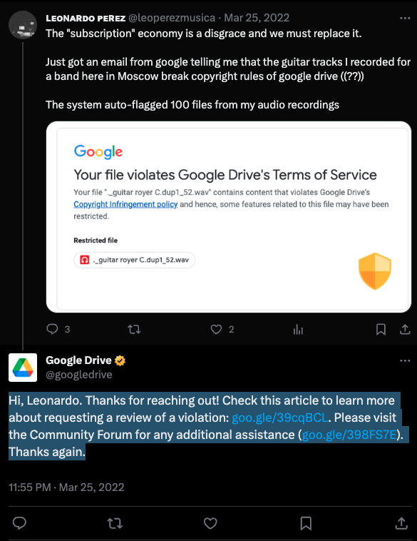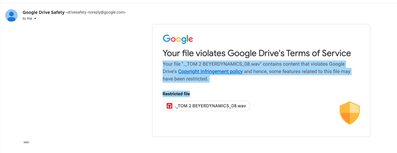 Im a music producer. I make records for a living. This means that my livelihood revolves around creating and distributing numerous WAV files via cloud services. On Thursday, Mar 24, 2022, at 10:31 PM, I received a series of emails from Google stating, "Your file violates Google Drive's Terms of Service." Specifically, the message read: "Your file '._TOM 2 BEYERDYNAMICS_08.wav' contains content that violates Google Drive's Copyright Infringement policy, and hence, some features related to this file may have been restricted. Restricted file." Approximately 100 files were affected.