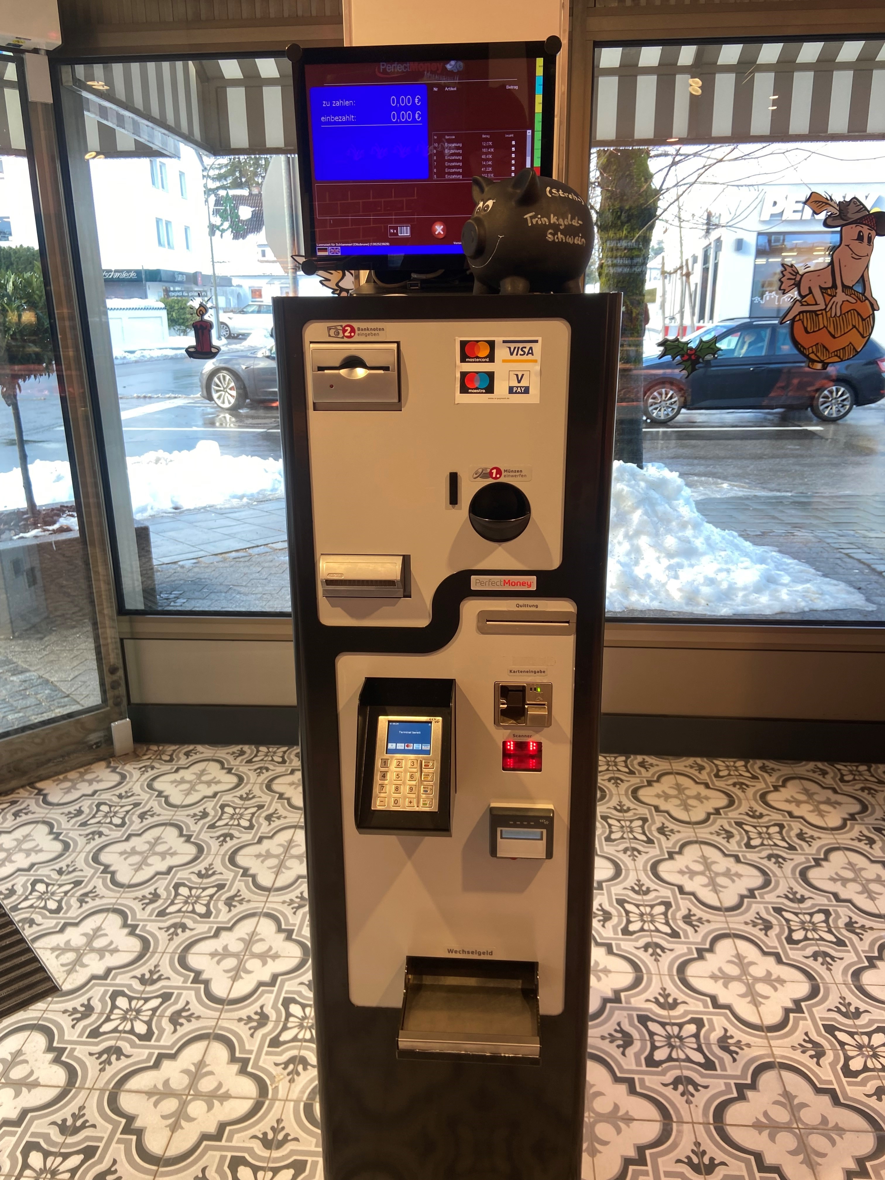 We embark on today's post about my homeland Bavaria and its traditions with this mornings purchase of Weißwurst or white sausages from the local butcher. As you can see, the counter generally offers a diverse selection. Besides various hams, sausage is unmistakably a Bavarian or German specialty. This particular butcher, in comparison to other small butchers in the area, has embraced digitalization. The entire payment process is conducted using a payment machine after the goods are received.