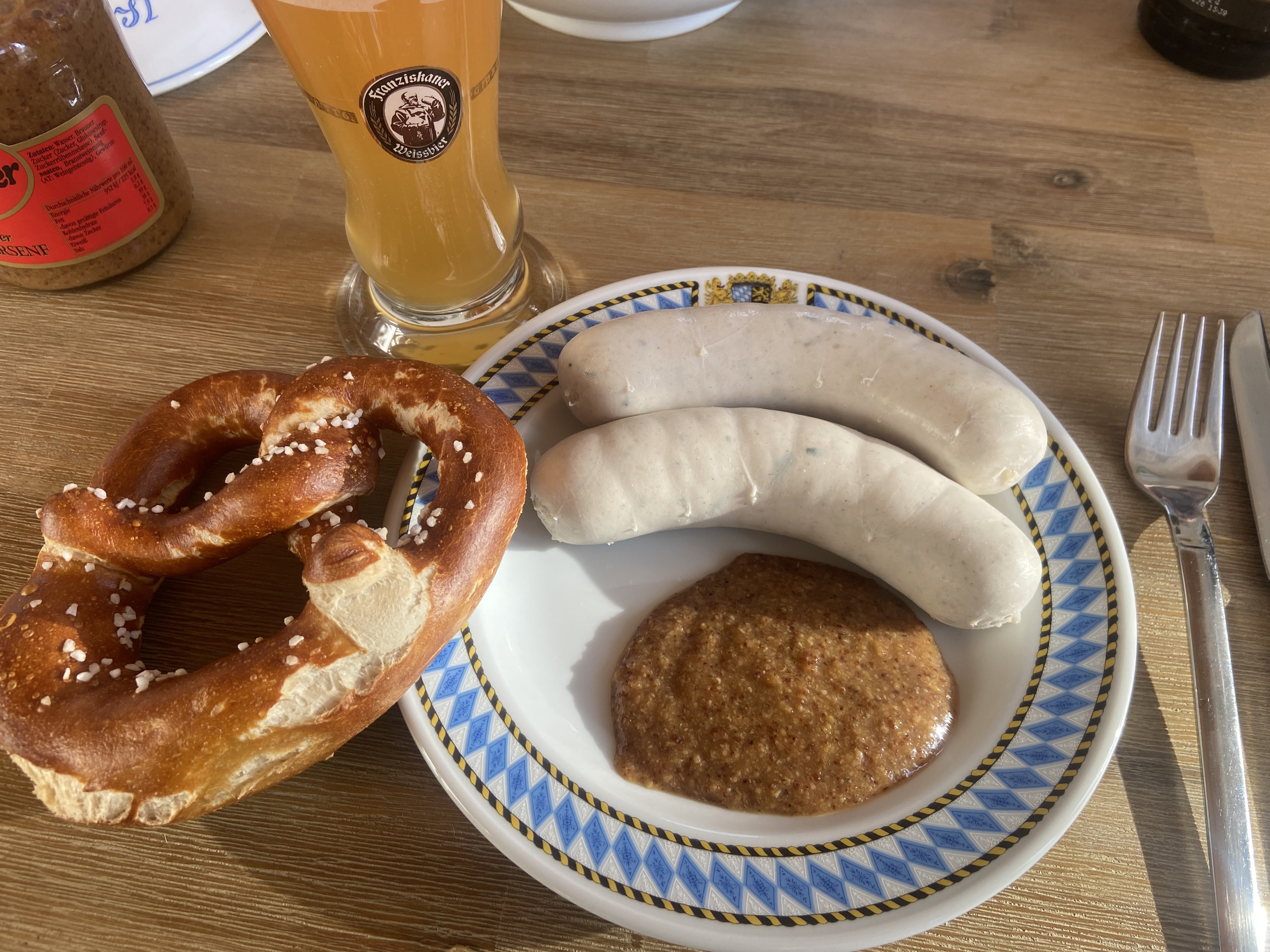 Regarding sweet mustard, there are, of course, multiple brands, but I highly recommend "Händlmaier" sweet mustard; it's truly exquisite. Typically, we pair Weißwurst and sweet mustart with pretzels (brezn how we say), which are available worldwide, but here they come with a generous amount of salt on top (perhaps a bit too much for my taste) and a glass of 0.5L Weissbier or wheat beer, which can be refilled multiple times. The "Maß" is a known quantity worldwide, referring to 1L beer glasses, but these are typically found only at Oktoberfest and local festivals. Also wheat beer is not consumed out of 1L glasses.