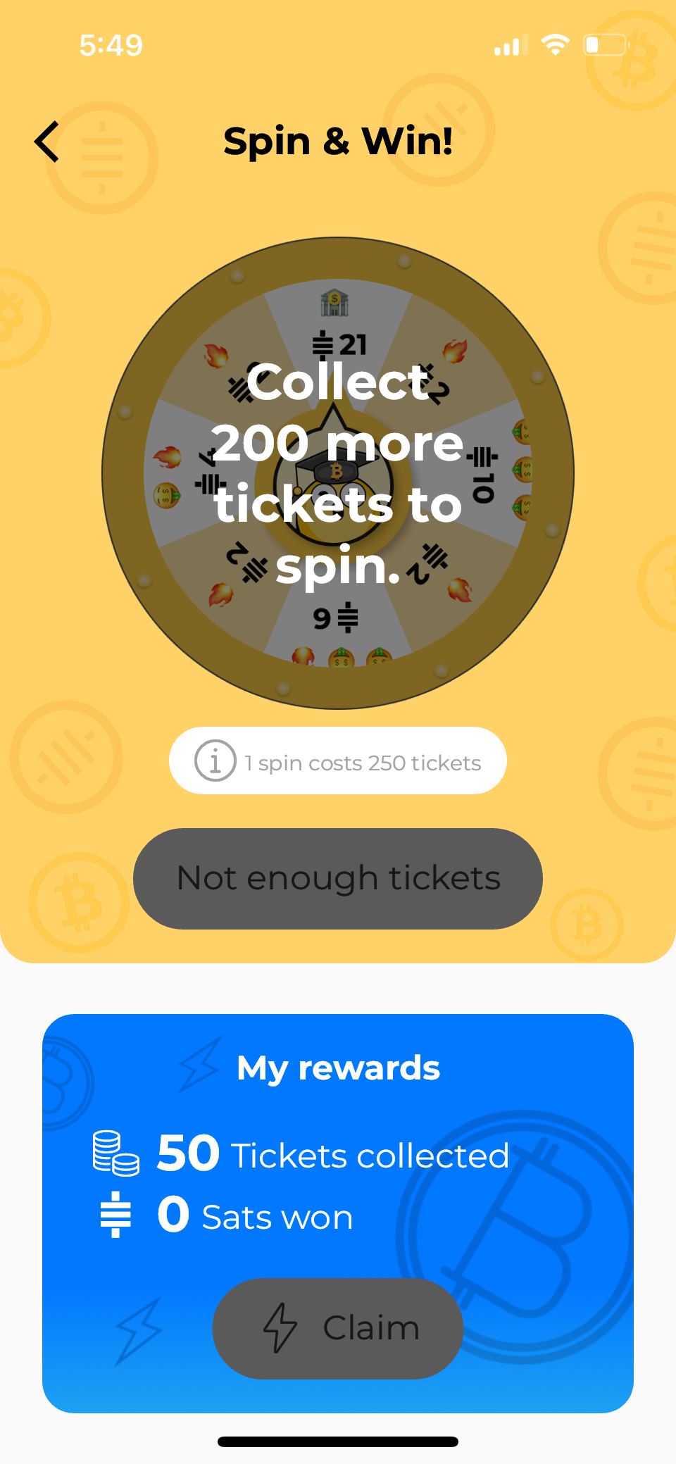 Once you collect enough tickets, it’s time for a spin. 250 tickets qualify you for a spin. You will get anything from 2 to 21 sats, so good luck.