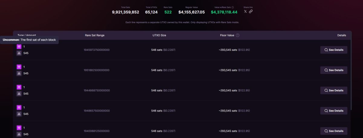 According to information from the Magic Eden website, each of these satoshis is valued at $123. In total, the address holds 522 rare satoshis, generating a profit of $222,500 (R$ 1.1 million) for the company in question. For comparison, the face value of a satoshi is only $0.00042.