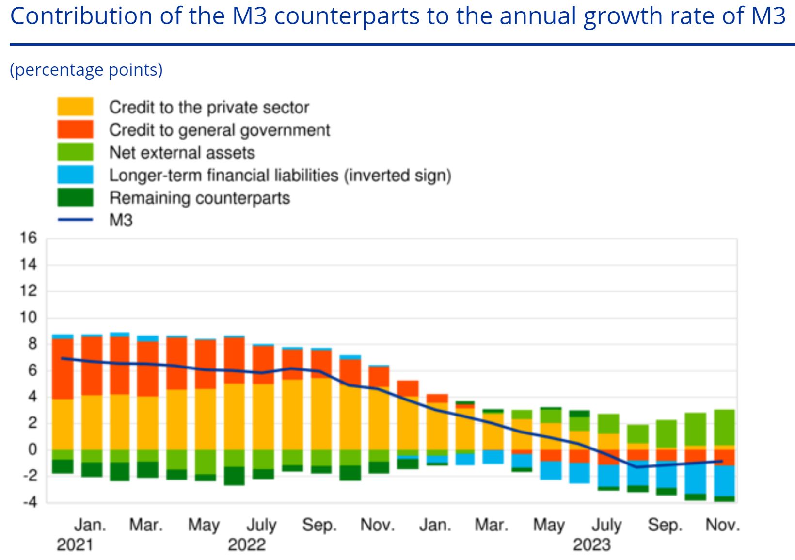 In November, the Euro money stock M3 experienced a contraction of 0.9% year-on-year, coupled with a notable 9.5% year-on-year drop in money stock M1. This financial intricacy is attributed to the dynamics of elevated interest rates, diminishing bank lending, and strategic changes within bank clients' portfolios.