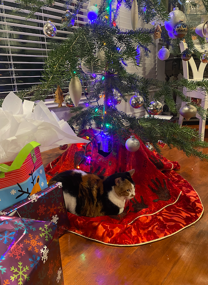 Every year, Pixie lays under the Christmas Tree for most of December.