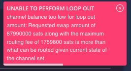 Yesterday, we tried to use LOOP out to get some of BTC back on-chain and address the liquidity imbalance of the 19 channels we batch opened recently. LOOP errored out at 90M, 80M, 70M, 60M, 50M, 40M, and then we gave up because the fee rate just became stupid for the benefit.