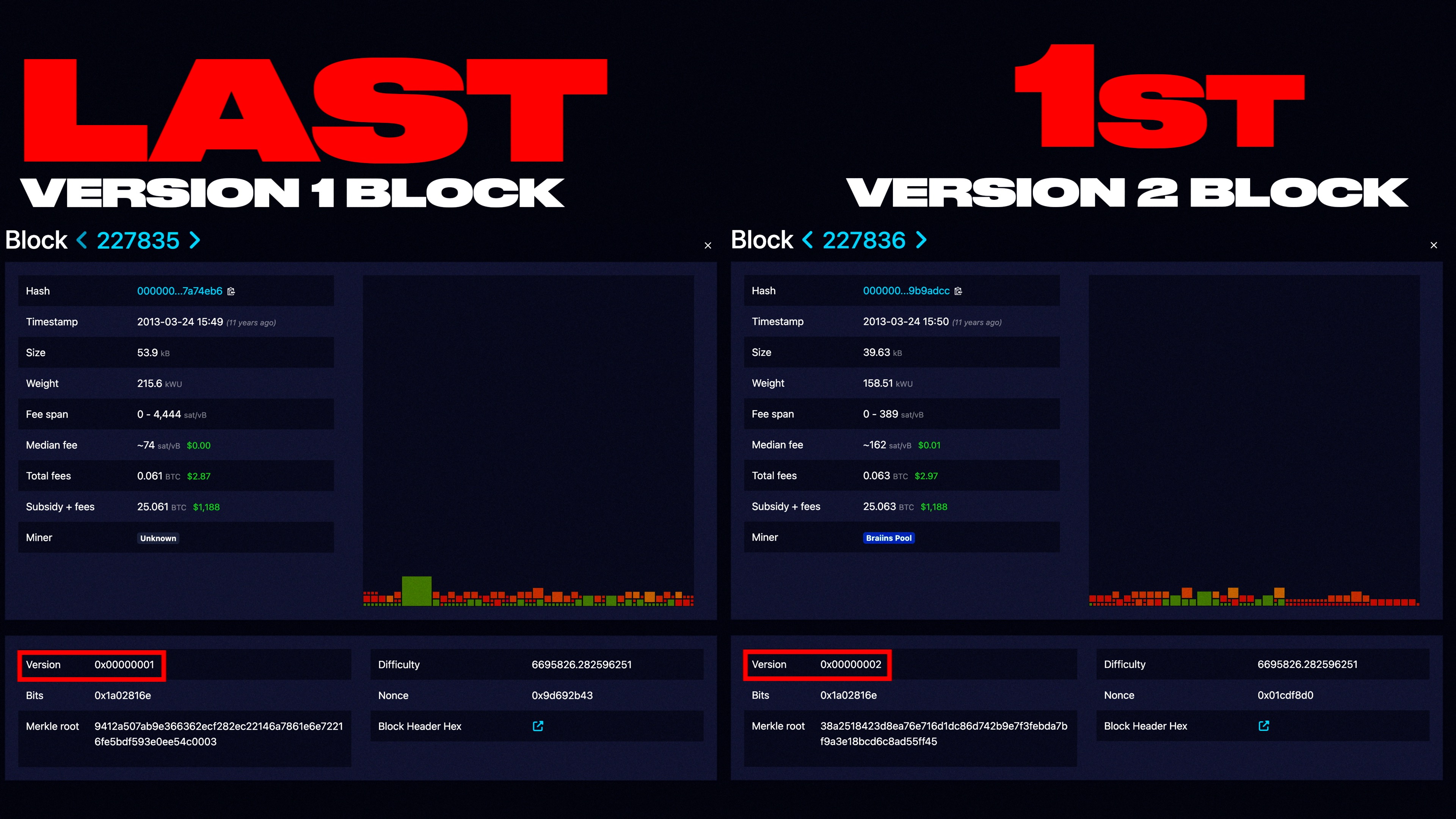 Also, and I quote, “The last version 1 block was 227,835, and it was mined on 3 March 2024” is bullshit. This happened a decade ago, and March 3 2024 is in the future.