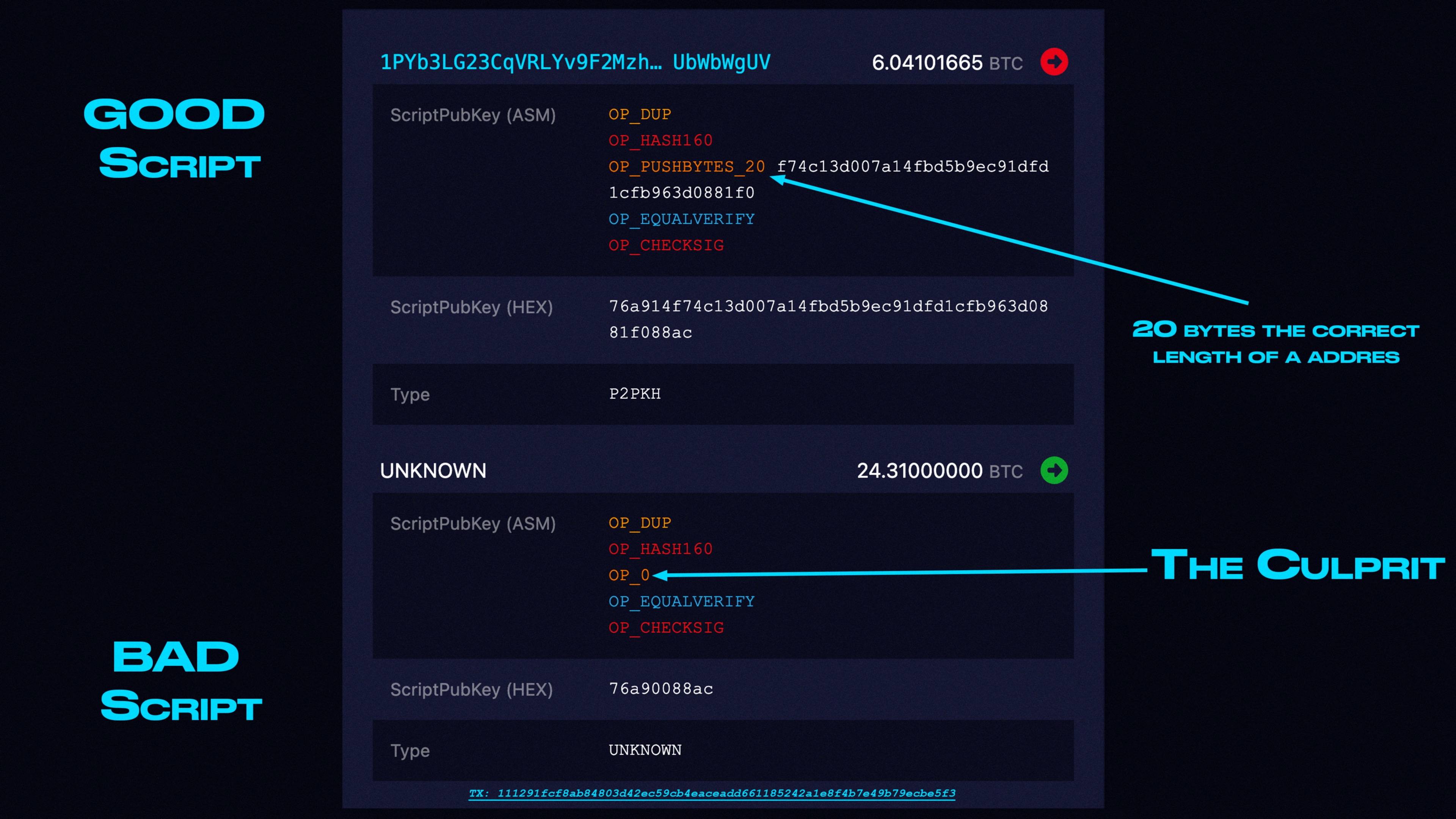 When we compare the two one thing stands out, there is no OP_PUSHBYTES_20 and instead there is an OP_0 and this is what makes the coins forever unspentable.