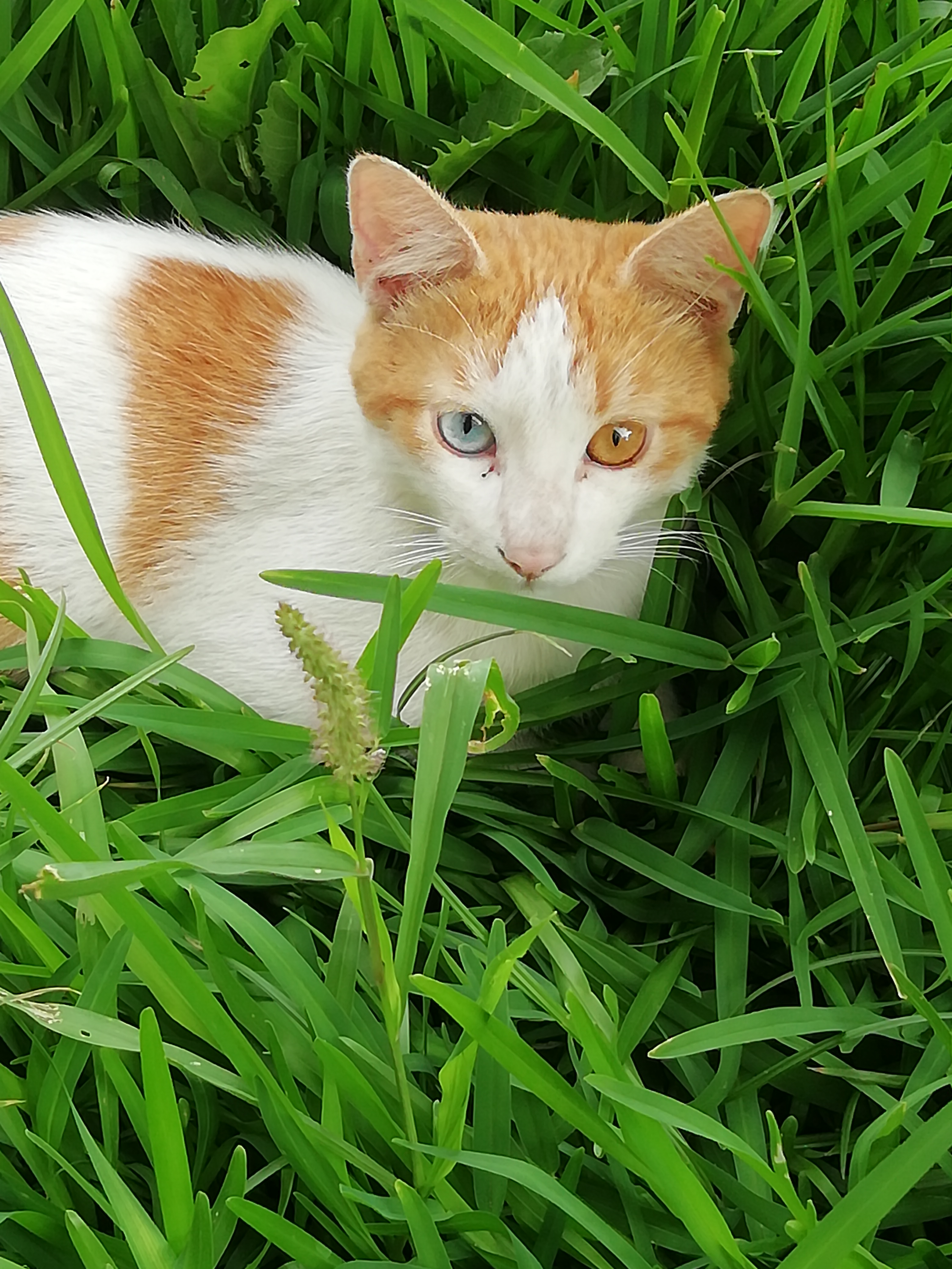 On my way home I ran into this cute kitten who surprisingly let me take a photo, waiting patiently. Then I wanted to investigate the reason for his small eyes and this is what I found: It is an eye anomaly in which the irises are a different color; It can also affect the skin or hair, but the most common case is the eyes, totally or partially. Complete heterochromia is most common in cats, although it can affect humans. Most often, the cat has one blue eye and one brown eye. It also occurs among dogs, especially in the Siberian Husky and Dalmatian breeds.