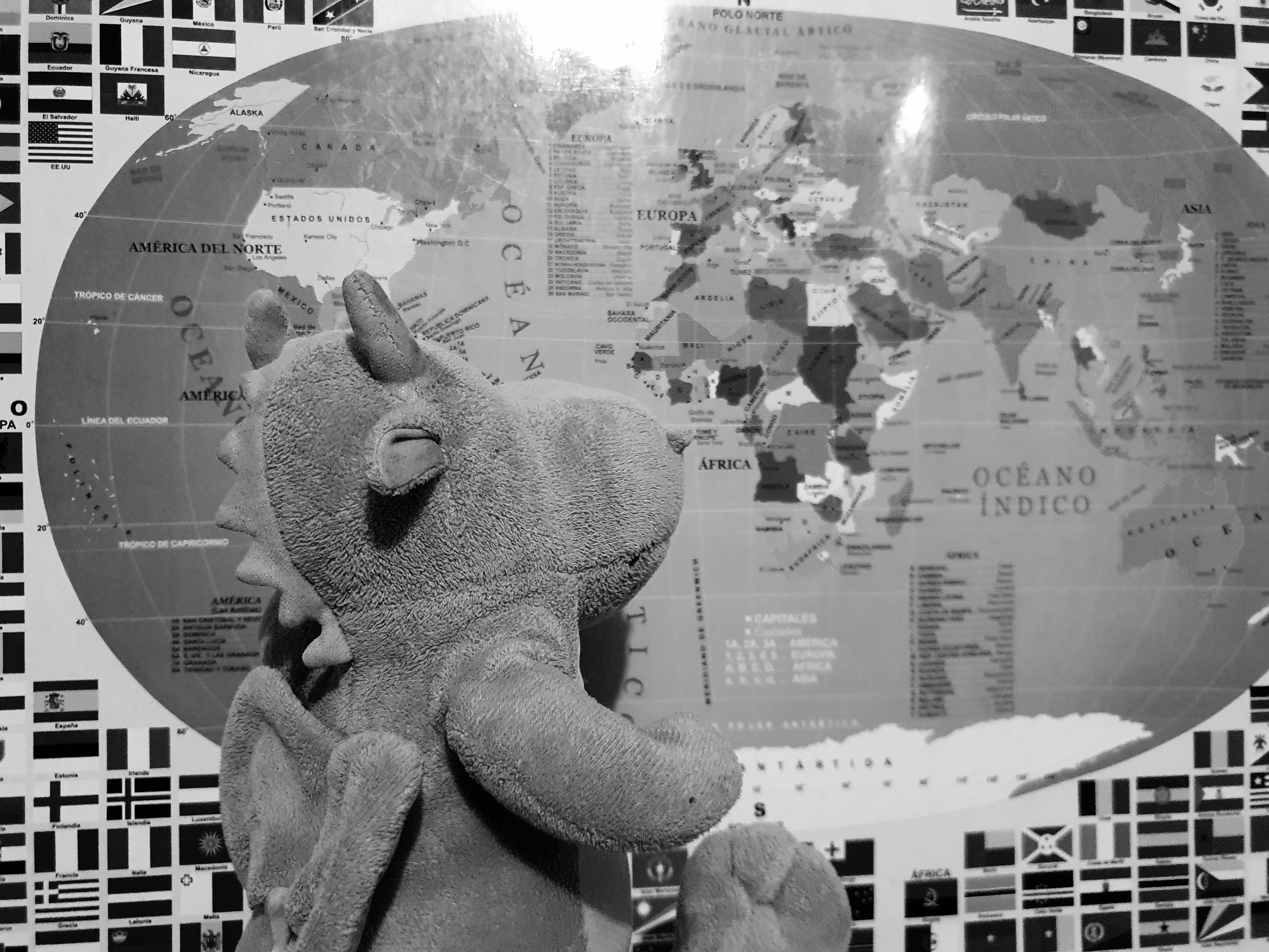Days that conquer melancholy, I don't really know in which territory I should write, but I think photographs are a good option, since there are none about family or something similar. That stuffed animal is called "Pupi" (that's how it is in Spanish), my daughter named it that and it is her attachment toy, that's what child psychologists call it. In a post I wrote, I said that I am an immigrant and that my most beloved family is divided into 3 countries and for various reasons it has been years since we have seen each other and my daughter does not know them. Christmas, birthdays, Mother's Day, graduation and any "special date" we celebrate by video call, we laugh, talk and cry in each one of them, there is never a lack of: "I miss them, I wish they were here" or phrases like "V. .. she is very big, beautiful and intelligent." My daughter loves our family despite the distance and although she has never shared with them physically. When she was approximately 3 years old she told me that she wanted a plane so she could travel, when she was 4 years old she asked Santa Claus for tickets, a car or whatever she would use to go see the family. She makes me cry. The newest and most recent thing that breaks my heart is that, in each source of wishes, she asks to get the whole family together and that we take two vacation trips: Disney and to Santa's village in Rovaniemi, Finland. In Latin America, it is a tradition in the new year to make 12 wishes by eating 12 grapes when all 12 are made. I don't know if it is a tradition on other continents. The point is that on December 31, which just passed, my daughter wished that again, but Today she surprised me with something she said to me: "Mom, why do people make wishes with grapes? They're just grapes, to achieve what you want you have to work for it." I just hugged her, agreed with her and told her that's what I'm working on. Now what does "pupi" the dragon have to do with all this? My daughter was telling me that his family is also divided throughout the planet, and she began to point out different countries on that map, mentioning each relative of Pupi the dragon and made up a story about why the dragon family is not together. I find it incredible how children use games to process information and their feelings.