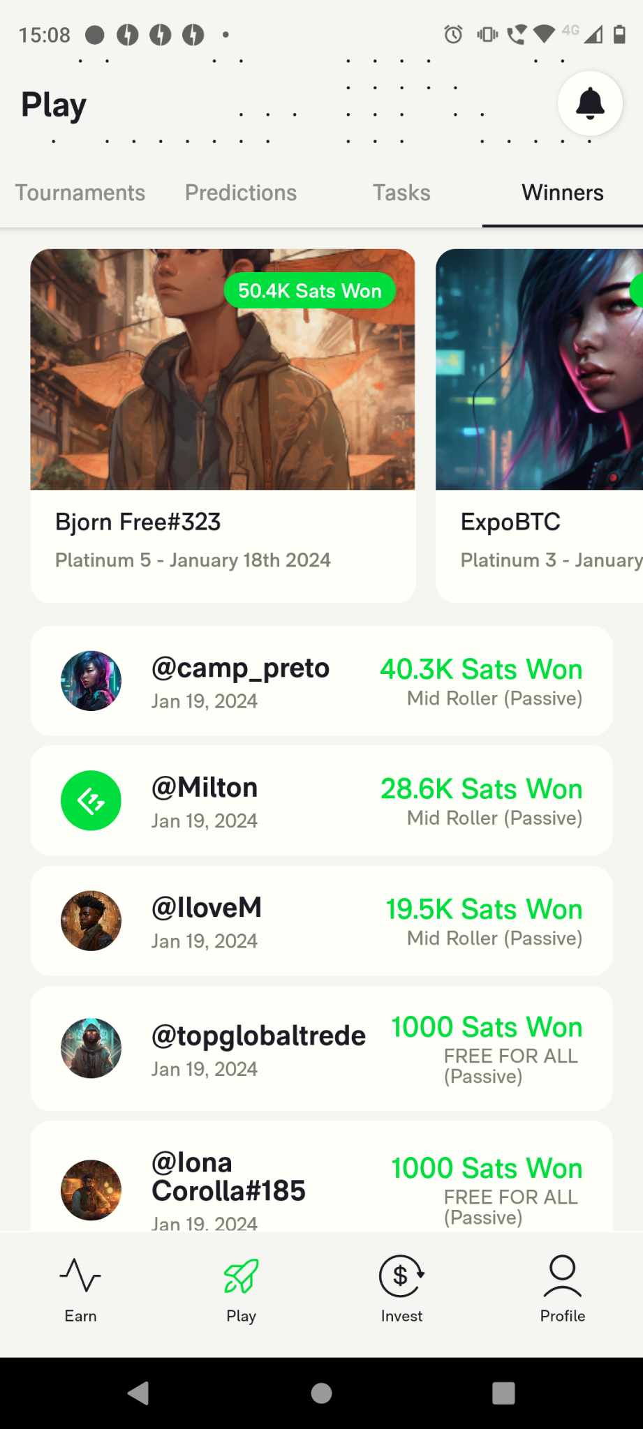 You can also stack some satoshis with entering trading tournaments (active or passive). Majority of tournaments have free entry, but exist tournaments where you need to pay entry fee in sats. These tournaments have higher rewards. I enter just on free tournaments.
