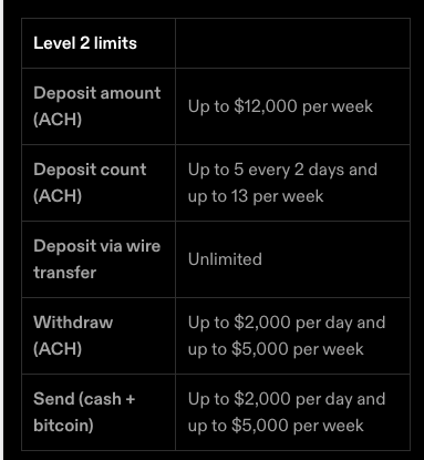 This is in comparison to CashApp which has hard limits of $2000/ day and $5000/week on-chain and $999/week on Lightning. I've talked to support a bunch to try and get those limits raised so that I can do more direct deposit with them and so far they have refused to budge.