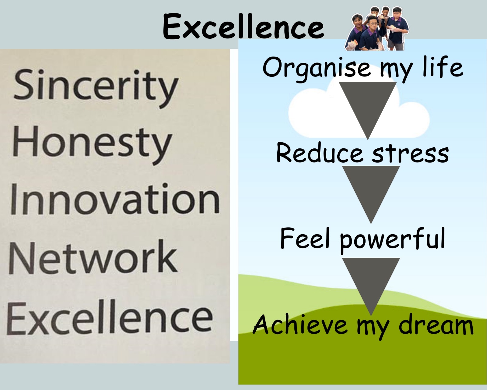Then, I got my students to write down in their diary everything they could recall. I was training their memory muscles, so I didn’t care for spelling. To round up this activity, I got the class to recall the five school values via the memory palace tool. I subsequently explained how “organise my life” will lead them to “achieve my dream”, like moving up steps of a ladder.