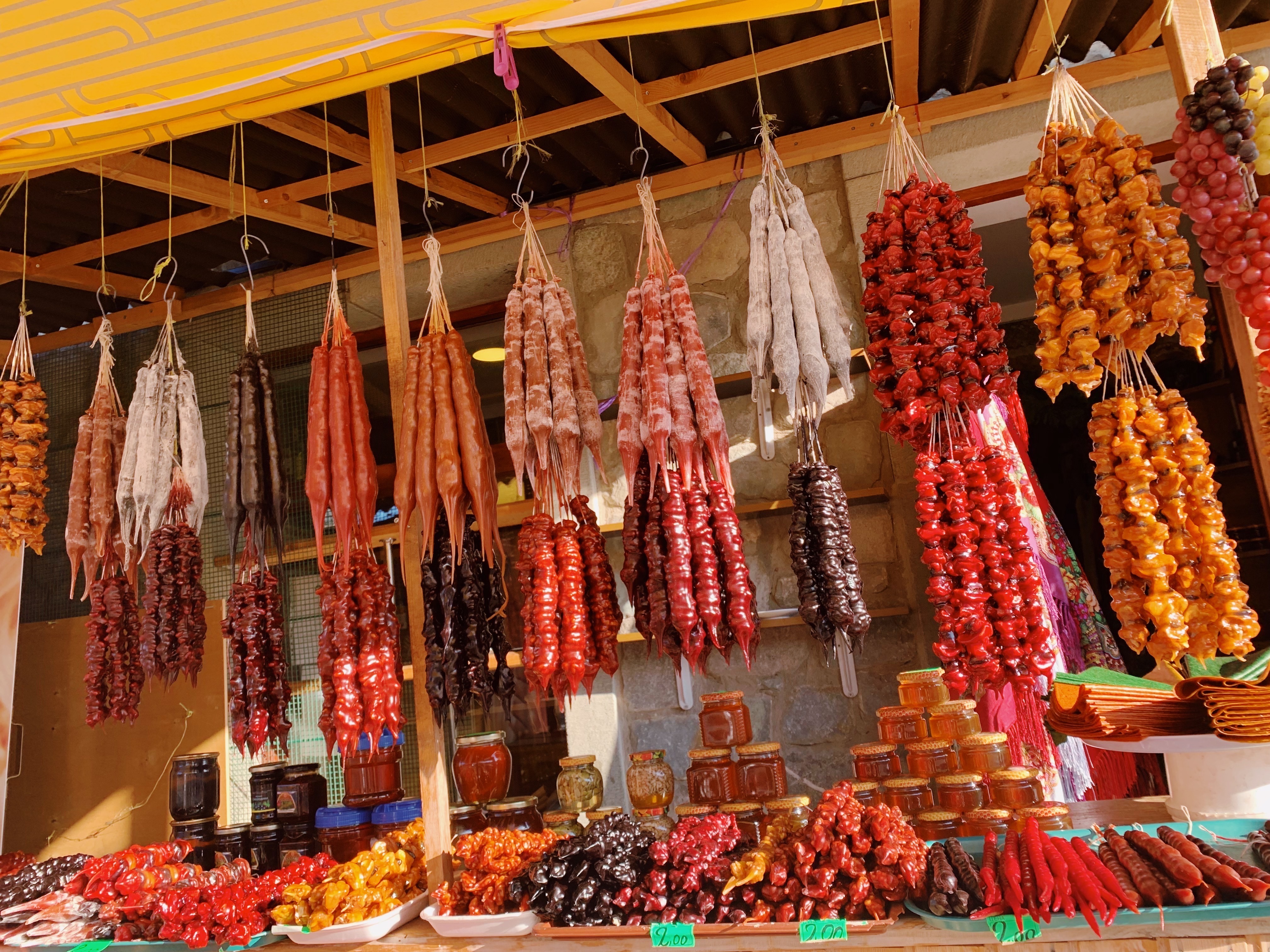 The first time I tried it was in Tbilisi, wow, so delicious! Then I found the similar thing in Turkey but it's called cevizli sucuk here, typing this as I'm eating them, and with a cup of Turkish coffee, simple life it is!