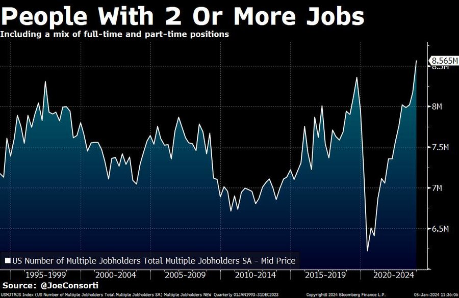 Currently, the US has a record ~8.6 MILLION people that are holding 2 or more jobs.