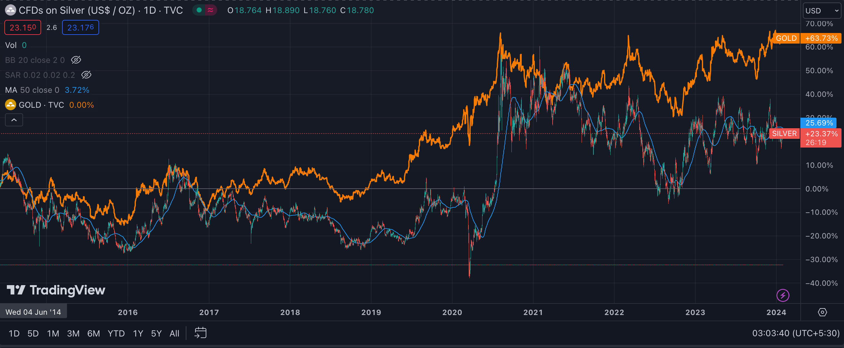 As you can see in the charts - during the 2020 - 2021 period the rate of growth in silver was pretty steep compared to that of gold.