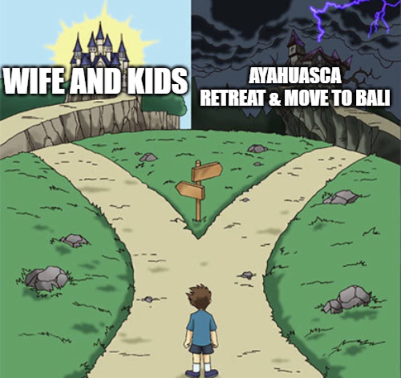 going against the grain here but 100% no to wife and kidsthough I don't want ayahuasca. I've been to Peru, I heard the stories. I don't want to vomit my stomach out for a day.