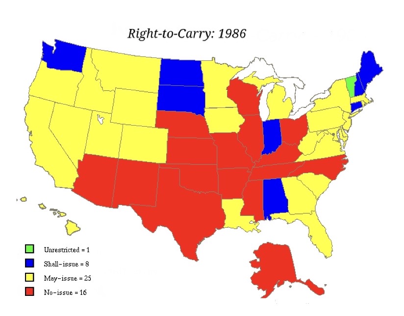 The transparent legal document over the x-axis (time) has distributed freedom relentlessly for 234 years. If you don't believe that, consider when the Constitution was ratified in 1790, slavery existed, women couldn't vote, native Americans were not citizens, judicial review hadn't been established, property rights... What happened over time however, is legal precedent built on top of legal precedent, as people asserted those transparent rights, and anybody standing in their way was essentially obliterated. The same thing will happen to anyone standing in the way of trans persons, like it or not, a repeat of 90s gay rights victories. Scientology couldn't even be stopped from a religious tax-free designation in 1993 for godssake. Or gun rights. Check this out, the first map is concealed carry state licensing from 1986. It's quite surprising to see Texas and so many red states as no-issue right?