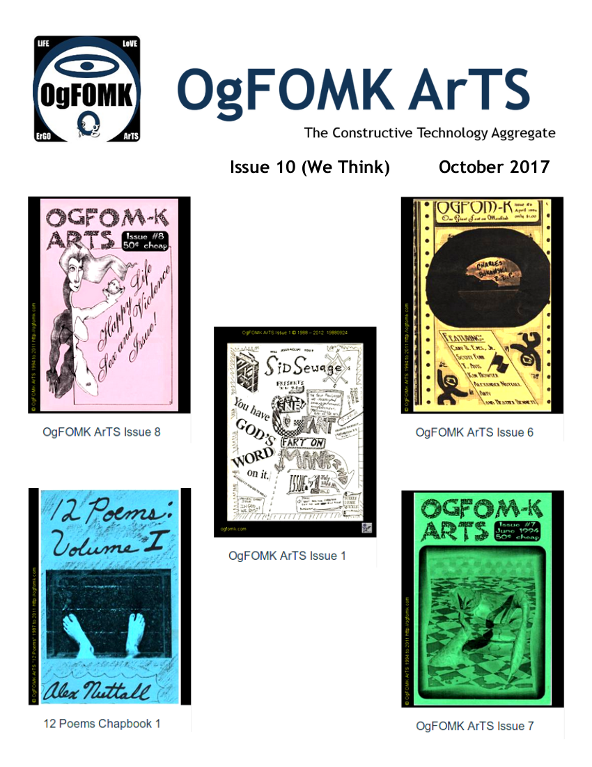 OgFOMK ArTS 'Zine Issue 10 (We Think) 2017. Featuring artwork, writing, photography, poetry and journals by Alex Nuttall, William Hawkes, Mykel Board, Gertrude Jewel, Lon Bennett, Cristy Johnson Bowen, Tom Deans and Verna Peddi.