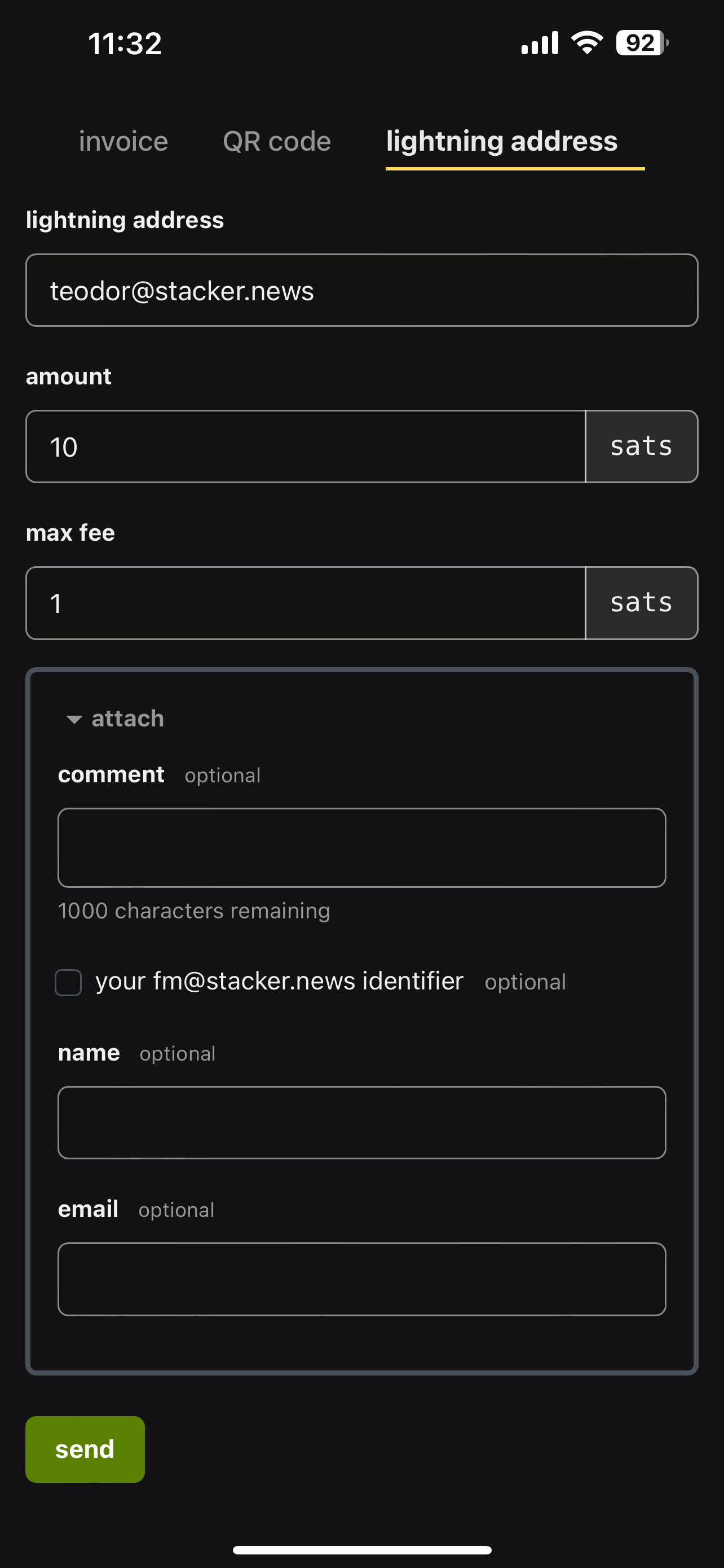 I sent it from my Wallet of Satoshi by scanning the Qr code on your profile (not from my stacker news wallet). I went to your profile, clicked on the yellow button, which opened up a QR code. I scanned that with my WoS, inputted an amount and hit send.