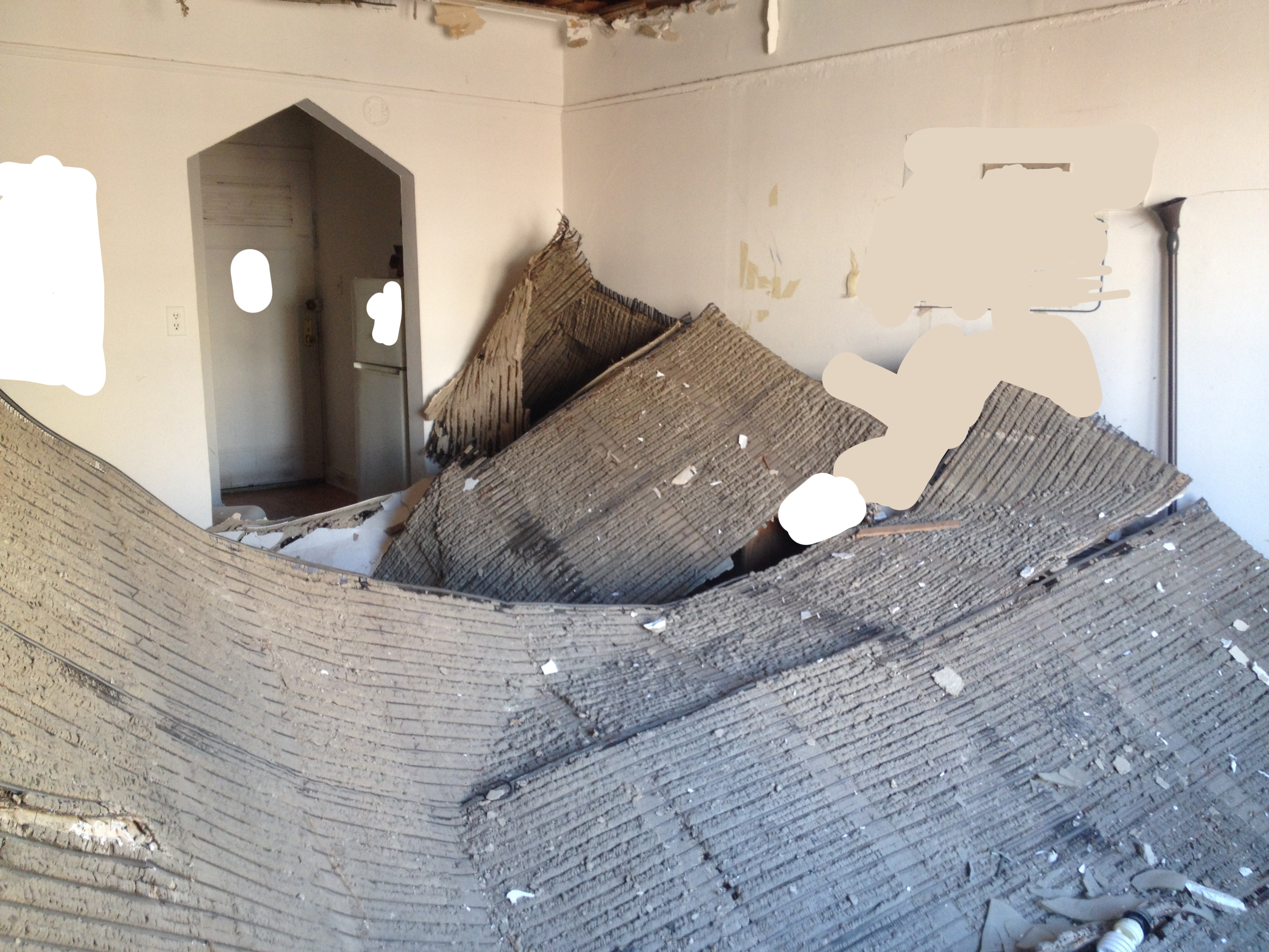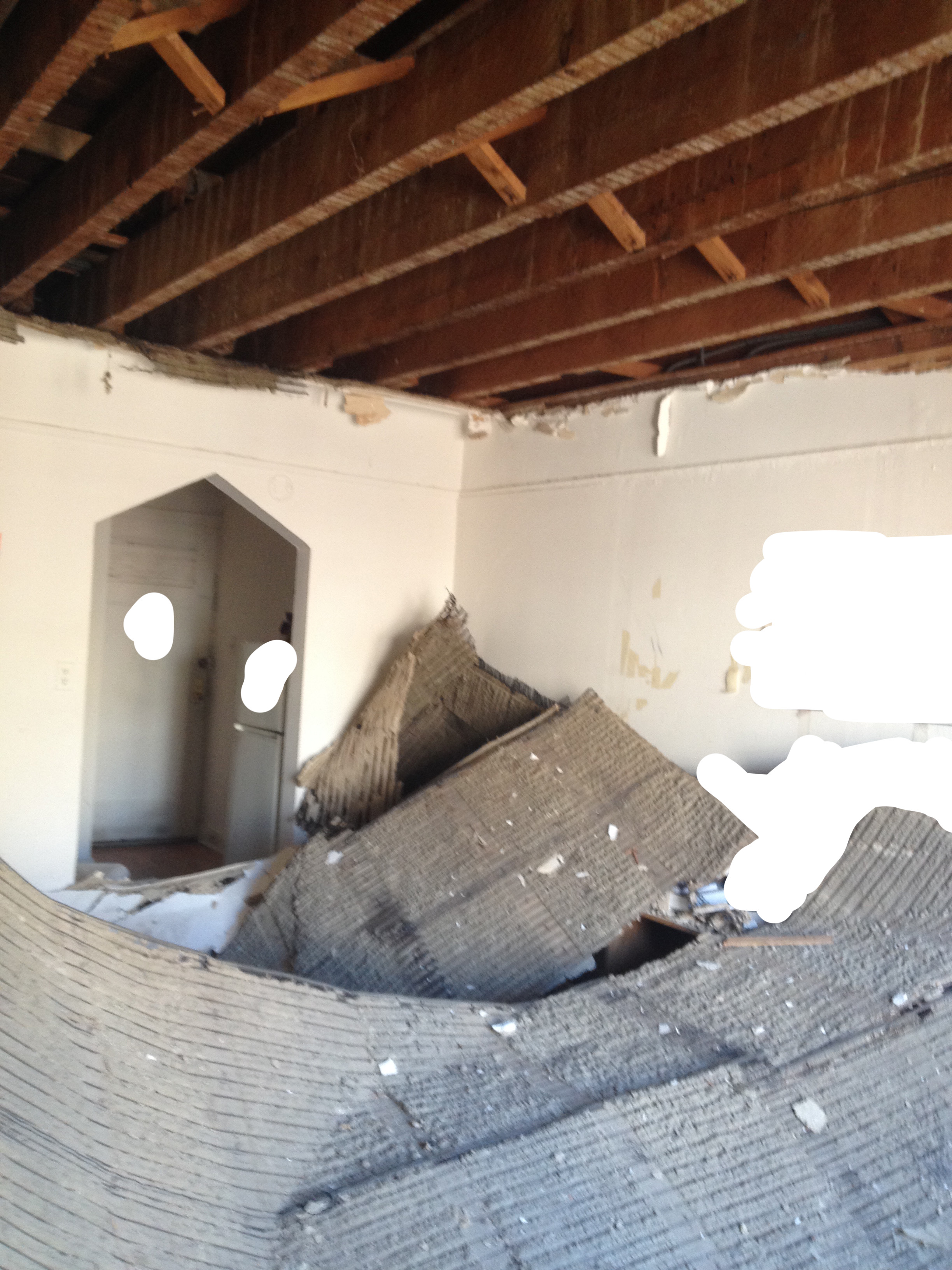 Turns out, after I left, my roof ceiling caved in. This wasn’t some dust and dry wall. This was a heavy concrete looking ceiling with heavy wire mesh on the inside. From the front door to the windows, a giant thick metal mesh and concrete just slammed down. Looked like giant metal/concrete blanket was covering everything.