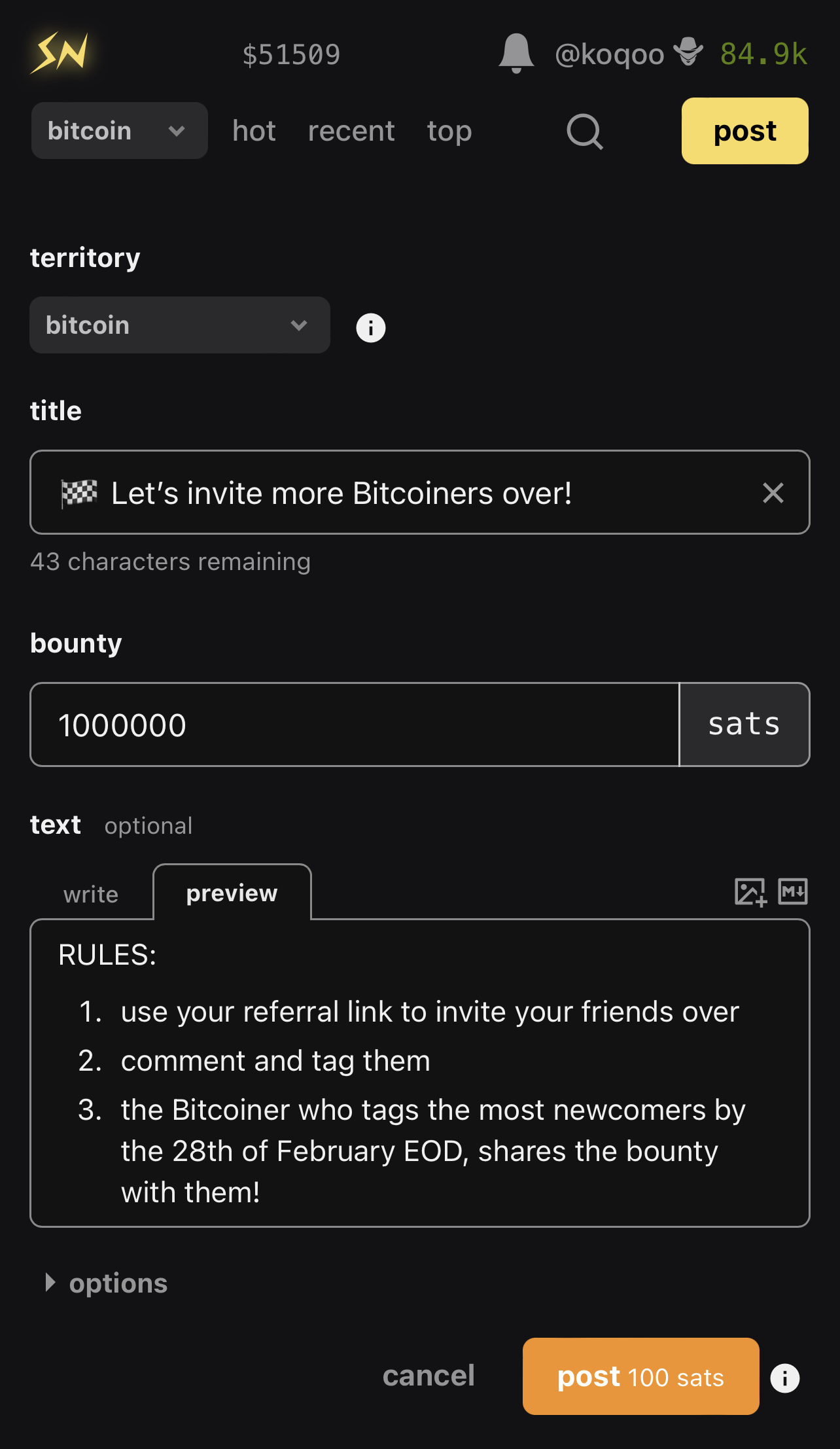 Good idea - could also spread the wealth instead of 100% for the winner, 50% for 1st, 30 for 2nd 20 for 3rd. Or even 'referral bonuses tripled for 30 days' or something like that.
