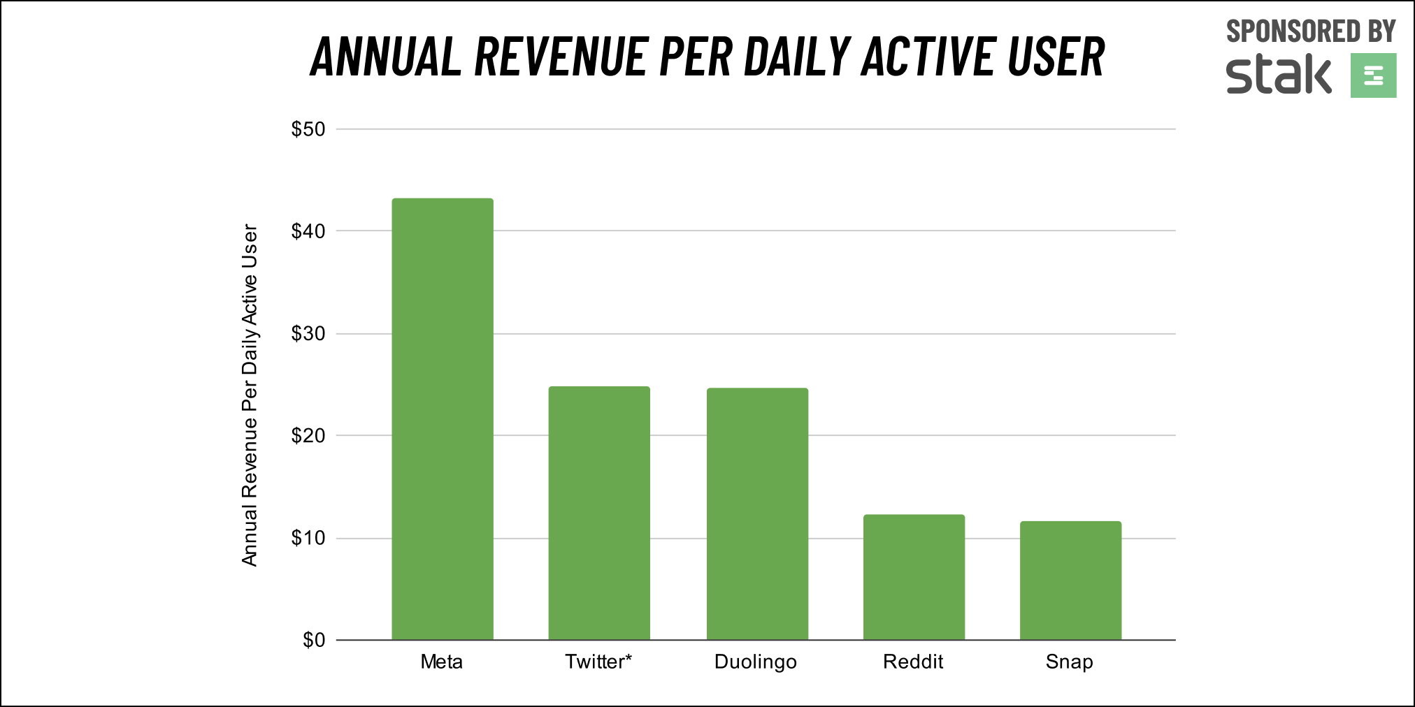 Most companies use slightly different metrics to determine active user numbers, and Twitter’s data gets an asterisk because it is only current as of 2021, but in general this shows a range of $11-$43 per daily active user.