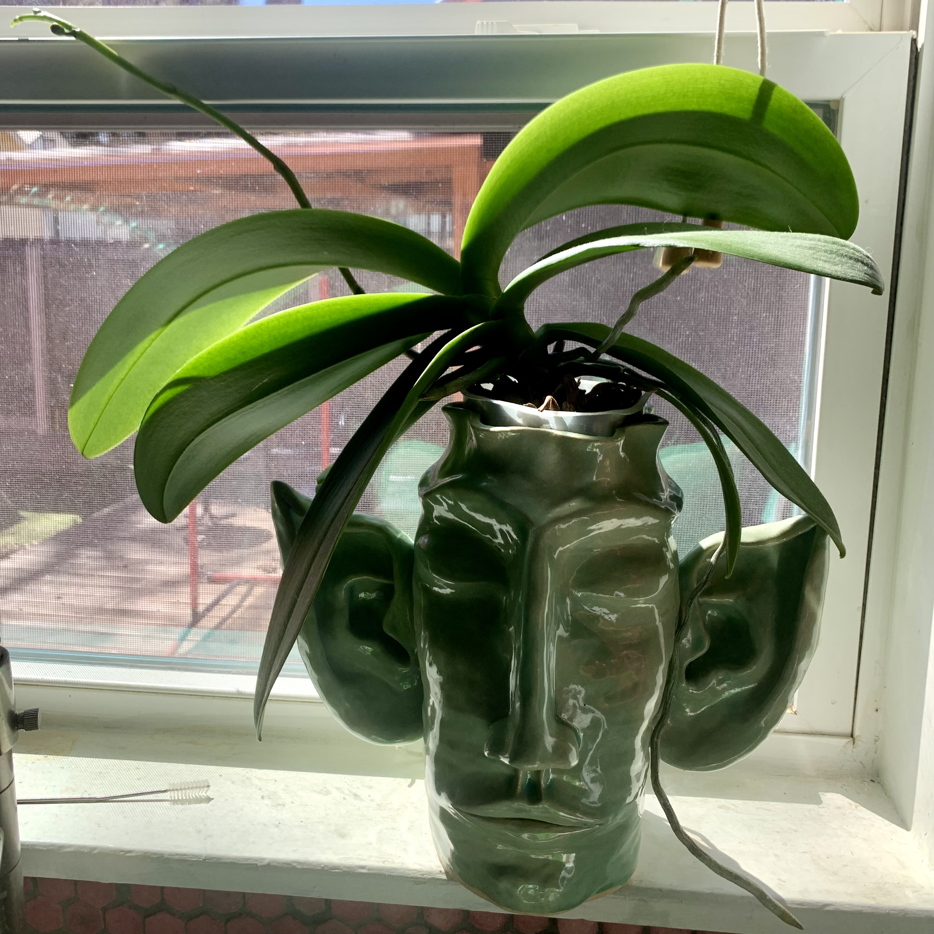 Oliver the Orchid is budding for the forth time. We found this vase at a thrift store that made a great orchid pot holder. Oliver's roots sit in a plastic pot that drains into the vase. The water at the bottom of the vase produces a high humidity environment for the roots without leaving them wet.
