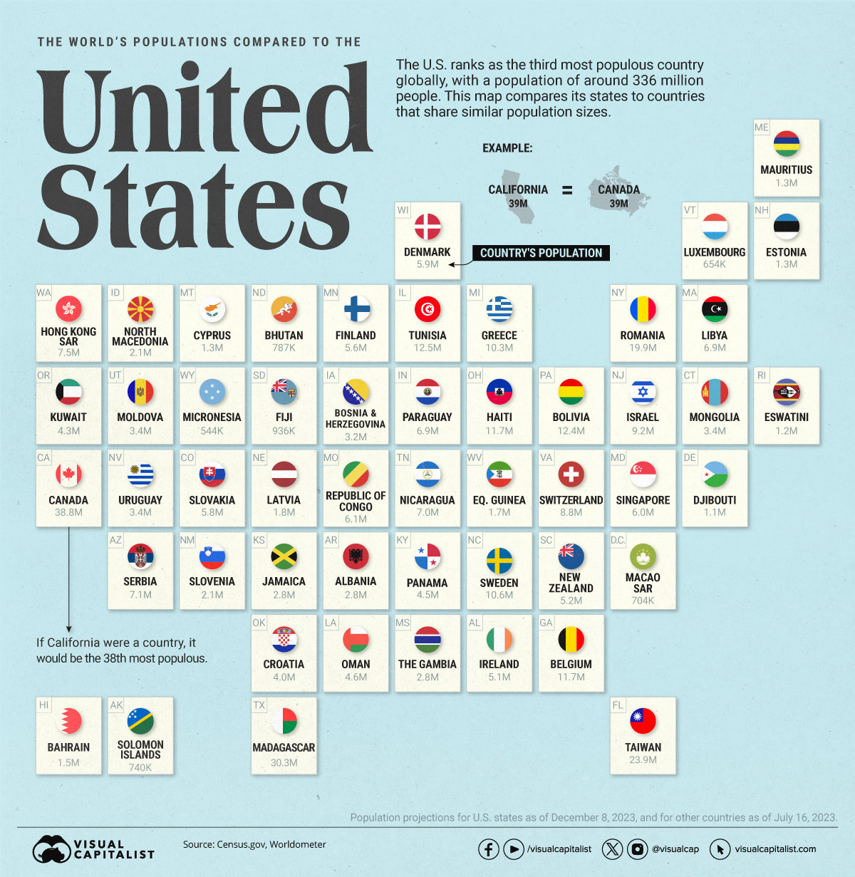 This map compares its states and Washington D.C. to countries with similar population sizes to provide a perspective on the U.S. population. The data is sourced from Census.gov and Worldometer, with population projections for U.S. states as of December 8, 2023, and other countries as of July 16, 2023.
