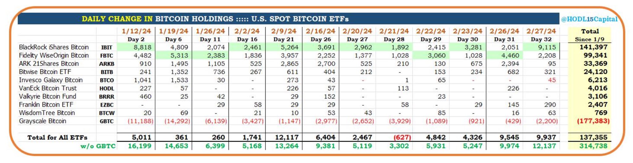For all the TA's and charts that people throw around, non have ever featured the effect of having 9 ETF's involved. These institutions are hoovering up all the BTC they can get their hands and they have only just got started. On the 27th alone they took in net 10,000 BTC and 900 BTC was mined. The US loves an ETF and once people over there wake up and realise that their Gold or S&P 500 ETF isn't making the kind of money that those over there with the BITCOIN ETF are making, then they're going to jump ship. The ETF 9 aren't the only ones buying big there's many others. Somebody today bought 700 BTC and it wasn't one of the 9 ETF's.